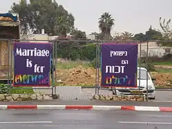 Stejnopohlavní manželství nebylo v Izraeli dosud uzákoněné. Izraelské zákony zaznamenávají stejnopohlavní manželství uzavřené v zahraničí, ale nedávají mu tento právní status po rozhodnutí Nejvyššího soudu v r. 2006, který došel k závěru, že: „Předtím než bude vydán rozsudek, je třeba zdůraznit, o čem dnes rozhodujeme, a o čem dnes nerozhodujeme. Rozhodujeme o tom, že by úřady měly smysl evidence obyvatel tvořící součást veřejné statistiky implikovat prostřednictvím veřejného certifikátu, který je jim prezentován navrhovateli, s odvoláním se na fakt, že jsou oddány, a že by měla být zachována role registračního úředníka jakožto sběratele statistických materiálů pro účely vedení evidence... Nerozhodujeme o tom, že by manželství mezi osobami téhož pohlaví měla být v Izraeli legalizována; nedáváme takovým manželstvím nový status; nepřijímáme žádnou novou pozici týkající se uznání zahraničních manželství osob stejného pohlaví v izraelských zákonech (ať už mezi izraelskými občany nebo mezi cizinci)“.[16] Občanské sňatky nejsou v Izraeli dosud přístupné ani heterosexuálním párům, a tudíž (mimo případy heterosexuálních manželů nepatřících k žádné uznávané náboženské komunitě v zemi)[17] je manželství institucí garantovanou pouze malým počtem oficiálně uznaných náboženských autorit působících v Izraeli. (Tato restrikce neblokuje pouze možnost oddávání homosexuálních párů, ale zároveň i mezináboženských heterosexuálních párů, případně nevěřících párů, kteří nechtějí svůj svazek stvrdit před orgánem církve. Ti všichni se tudíž musí nechávat oddat v zahraničí.)