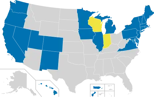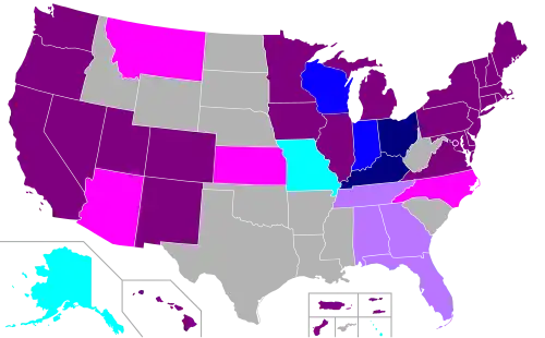 Poté co v r. 1996 prošel Zákon o ochraně manželství, mnoho zákonodárců jednotlivých států přijalo své vlastní podpůrné manželství chránící zákony, které zakazovaly stejnopohlavní manželství.[55] Prvním z nich se stal v r. 1972 Maryland následován dalšími, z nichž všechny, kromě Nového Mexika, přijaly své vlastní zákony zakazující manželství osob stejného pohlaví, platné až do června 2015.