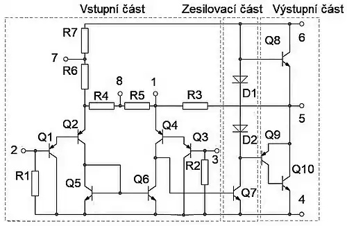 Prvním blokem je emitorový sledovač, tvořený tranzistory Q1 pro invertovaný vstup a Q3 pro neinvertovaný, který společně s vstupními rezistory R1 a R2 určuje vstupní impedanci, a díky předotevření tranzistorů umožňuje zpracování záporného napětí. Dalším členem je rozdílový zesilovač složený z tranzistorů Q2 a Q4, jehož zesílení určují rezistory R4 a R5. Stejný proud na obou stranách rozdílového zesilovače zajišťuje proudové zrcadlo složené z tranzistorů Q5 a Q6. Rezistory R6 a R7 slouží k omezení kolektorového proudu, rezistor R3 pak omezuje proud vstupující do báze tranzistoru Q7, který v zapojení se společným emitorem funguje jako hlavní výkonový zesilovač. Výstupní část zesilovače pak tvoří tzv, push-pull zapojení dvou tranzistorů Q8 a Q9,10 (složen ze dvou tranzistorů Q9 a Q10 v zapojení Sziklai). Diody D1 a D2 slouží ke kompenzaci přechodového zkreslení. Výstupní tranzistory nezačnou vést proud, dokud vstupní signál nepřekročí prahové napětí báze-emitor (cca ± 0,7 V). Pomocí těchto diod je zajištěno, že toto napětí nikdy neklesne pod prahovou hodnotu, tranzistor tak pracuje stále v lineární oblasti.[2]