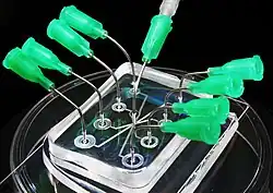 - ↑ Gomez, Frank A. Biological Applications of Microfluidics. [s.l.]: [s.n.] ISBN 978-0470074831.