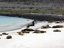 - ↑ DENKINGER, Judith; GORDILLO, Luis; MONTERO-SERRA, Ignasi; MURILLO, Juan Carlos; GUEVARA, Nataly; HIRSCHFELD, Maximilian; FIETZ, Katharina. Urban life of Galapagos sea lions (Zalophus wollebaeki) on San Cristobal Island, Ecuador: colony trends and threats. S. 10–14. Journal of Sea Research [online]. 2015-11 [cit. 2021-12-06]. Roč. 105, s. 10–14. doi:10.1016/j.seares.2015.07.004. (anglicky)