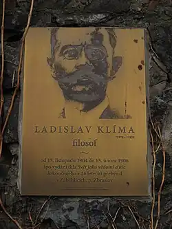 Text: „Ladislav Klíma *1878 †1928 filosof od 15. listopadu 1904 do 15. února 1906 (po vydání díla Svět jako vědomí a nic dokončeného v 26 letech) přebýval v Záběhlicích, p. Zbraslav“.