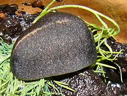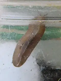 Je to oválný, tmavě hnědě zbarvený plž bez ulity s jemně hrbolkovitou pokožkou. Velikost až 7–8 cm. Kýl má béžovou barvu. Má zvláštní velmi úzké chodidlo, které je u malých jedinců pouze 1 mm úzké, u větších je relativně silnější asi 4–5 mm silné. Má malá tykadla, asi 2–3 mm dlouhá. Tykadla vystrkuje pouze málo.