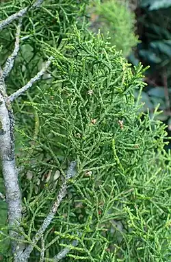 Strom s hustou kuželovitou nebo pyramidální korunou vysoký 20 až 30 m, který mívá výčetní tloušťku 70 až 100 cm. Kmen bývá rovný, kůra je šedá až hnědá, ve stáří je tlustá až 6 cm, podélně zbrázděná, vláknitá a loupe se v pásech. Větve jsou dlouhé a obvykle svěšené. U mladých jedinců jsou listy úzké, čárkovité, dvouřadě uspořádané. Později vyrůstají ve spirále listy šupinovité, asi 1 až 2 mm dlouhé a 0,7 až 1 mm široké, silně kýlnaté, těsně přitisklé, na vrcholu tupé, na hřbetě mají roztroušené bílé průduchy. Mladé stromky někdy zpočátku rostou neuspořádaně, spíš jako keře.