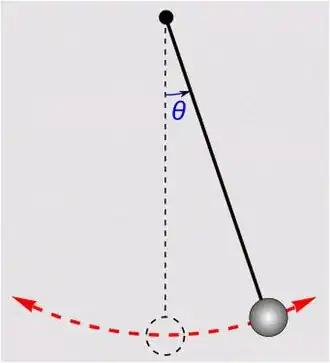 V každém bodě kružnice, po které se bod kyvadla může pohybovat, je vzdálenost od počátku konstantní . Pohyb kyvadla tak závisí pouze na souřadnici .[pozn. 2] Zvolme si jako úhel .
