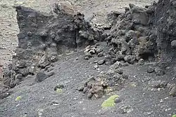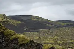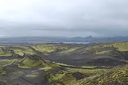 ![]() Pohled na prasklinu na úpatí Laki, ze které unikala láva do širokého okolí | |
