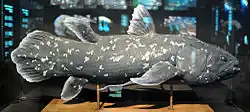 ![]() Konzervovaná latimérie podivná (Latimeria chalumnae) chycená roku 1974 u Komorských ostrovů. | |