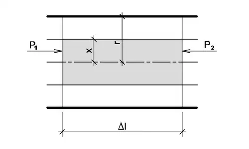 Uvažujme v trubici o poloměru malý válec kapaliny o poloměru a délce . Na vstupní průřez tohoto válce působí tlak a na výstupní průřez tlak . Tlakový rozdíl na délce má hodnotu . Tlaková síla, která na válec působí ve směru toku, je