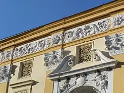 Obdélná okna paláce jsou vložena do profilovaných šambrán. V patře je nadpraží oken ozdobeno rozvilinami, nad nimiž se nachází rovné římsy,[7] a pod okny jsou vpadlé výplně.[3] Nad každou římsou je pak ještě malé čtvercové zamřížované půdní okno.[7]