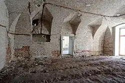 Do vnitřních prostor lze vstoupit portálem z náměstí a průjezdem ve východním křídle z Masarykovy ulice. Za portálem je zachována část původního průjezdu se dvěma křížovými klenbami na renesančních konzolách. Druhá část průjezdu směrem ke dvoru je oddělena příčkou a má valenou klenbu. Napravo od průjezdu (směrem k Masarykově ulici) se nachází obdélná místnost zaklenutá dvěma českými plackami a vlevo je velká čtvercová místnost s lunetovou klenbou, k níž ještě přiléhá komora, opět zaklenutá českými plackami. Na komoru navazuje krátké do dvora směřující západní křídlo, které je v přízemí také klenuté. Přízemní prostory východního křídla jsou neklenuté. Do patra se vstupuje schodištěm ve východním křídle, kde se nad průjezdem nachází horní mázhaus s valenou klenbou a lunetami. Klenuté jsou též přilehlé prostory. Všechna křídla budovy jsou ve dvoře v patře opatřena pavlačemi na konzolách.[7]
