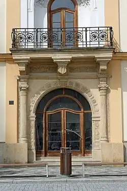 Patro budovy je od přízemí opticky odděleno kordonovou římsou.[7] Na balkón, opatřený železným parapetem[3] a mřížovaným železným zábradlím,[7] se vstupuje francouzským oknem v mělké nice.[3] Její archivolta je vyplněna vysokými štukovými reliéfy[7] zobrazujícími Boha Otce se symbolem Ducha svatého. Nad výklenkem pod římsou je kartuš a reliéfy postav letících andělů ve cviklech.[3] Po stranách niky stojí dva pilastry, na nichž spočívá římsa a dvěma vztyčenými volutami tvořený štít.