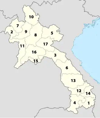 Laos se dělí na 16 provincií (qwang) a jednu prefekturu (Nakhonluang ViengChan), která obsahuje území hlavního města (Na Kone Luang Vientiane). Provincie se dále dělí na distrikty (muang) a vesnice (baan).