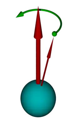 Magnetické pole vyvíjí kroutící moment na magnetický moment částice:[zdroj?]