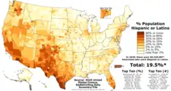 V roce 2012 bylo v USA 52,96 milionu Hispánců a Latinos, což odpovídalo 16,88 % celkové populace. V roce 2020 byl počet již 65,33 milionu (podíl 19,5 %).
