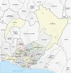 Sousedními obcemi jsou Bottens, Bretigny-sur-Morrens, Chavannes-près-Renens, Cheseaux-sur-Lausanne, Crissier, Cugy, Ecublens, Epalinges, Froideville, Jouxtens-Mézery, Le Mont-sur-Lausanne, Montpreveyres, Morrens, Prilly, Pully, Renens, Romanel-sur-Lausanne, Saint-Sulpice, Savigny a francouzské obce Évian-les-Bains, Lugrin, Maxilly-sur-Léman a Neuvecelle. Při zpracování z roku 2000 počítal Federální statistický úřad do aglomerace Agglomération lausannoise oblast s 65 obcemi.