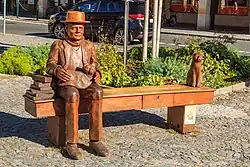 Lavička má podobu sedícího spisovatele s kloboukem a jednou kočkou na klíně a druhou sedící na opačné straně lavičky. Vedle spisovatele leží na lavičce několik knih. Během zimních měsíců je lavička přesouvána do veřejných prostor radnice.