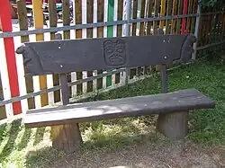 Detail vyřezávaného bobra na konci opěráku lavičky -