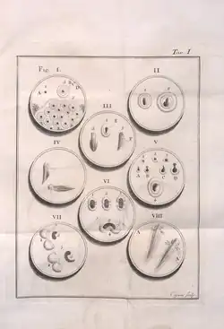 Spallanzaniho nákres z knihy Rostlinná a zvířecí fyzika r. 1780Od r. 1761 se Spallanzani zabýval teorií samooplodnění (vegetativní síly), kterou prosazovali v Anglii Needham a Buffon. Stejně jako Aristoteles tvrdili, že život může vzniknout samočinně z neživé hmoty. Spallanzani po čtyřech letech pokusů a pozorování mikroorganizmů prokázal, že tato teorie je mylná, což popsal v díle nazvaném Esej mikroskopických pozorování týkajících se generačního systému pánů Needhama a Buffona (Saggio di osservazioni microscopiche concernenti il sistema della generazione de’ signori Needham e Buffon).[4] Tato práce mu přinesla uznání a věhlas v celé Evropě. Porovnával chování mikroorganizmů ve skleněných baňkách uzavřených korkovými zátkami nebo se zatavenými hrdly (bez přístupu vzduchu), které nechával přejít varem po různou dobu. Zjistil, že v zatavených baňkách je po delší době varu výskyt mikrobů minimální na rozdíl od baněk, do kterých se mikrobi dostávají během varu ze vzduchu přes korkové zátky. Došel k závěru, že mikrobi mají různou teplotní odolnost a všechno živé musí mít živé předky. Izoloval jednoho mikroba v kapce vody a pod mikroskopem sledoval jeho rozmnožvání dělením.[1][2]