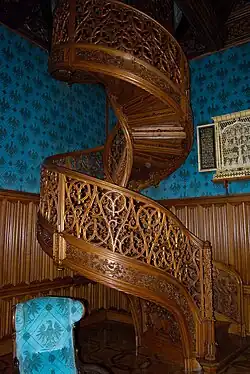 - letní jídelna s cínovým nádobím a krásnou zámeckou knihovnou s kazetovým stropem z lipového a dubového dřeva a s bohatě vyřezávaným točitým schodištěm vyrobeným z jednoho stromu