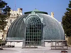 V letech 1843–1845 byl na východní straně zámku postaven 92 m dlouhý, 13 m široký a 10 m vysoký skleník s litinovou konstrukcí, projektovaný architektem Jiřím Wingelmüllerem. Na stavbě se podílel anglický konstruktér Peter Hubert Desvignes (1804–1883). Pokrývá ho 52 tisíc kusů skleněných tašek ve tvaru rybích šupin. Litinové sloupy mají tvar bambusu. Skleník, který vyšel na 160 tisíc zlatých, vytváří předěl mezi parterovou a přírodně krajinářskou částí zámeckého parku. Uvnitř se pěstuje cca 250 druhů tropických a subtropických rostlin. Zájem vzbuzuje především cykas Encephalartos altensteinii, jehož stáří se odhaduje na 300 až 500 let. Tvrzení, že rekonstrukce skleníku v 90. letech nebrala ohled na význam zdejších rostlin se ukázalo nepravdivým, byla podniknuta různá opatření k zabezpečení této cenné rostliny. Vzhledem k jejím velkým rozměrům ji však nebylo možné vyvézt z rekonstruovaného skleníku a došlo tak k částečnému poškození růstového vrcholu tohoto stromu, které ovšem nemá vliv na jeho vzhled a zřejmě ani na další jeho existenci.