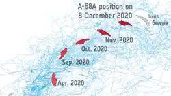 Na konci roku 2020 se A-68a přiblížila k ostrovu Jižní Georgie v jižní části Atlantského oceánu,[pozn. 1] což vyvolalo obavy z ohrožení tamních kolonií tučňáků a tuleňů. Ledovec mohl v případě nárazu na pobřeží zablokovat trasy, po kterých se zvířata vydávají za potravou, případně rozdrtit živočichy žijící u (v těchto místech mělkého) mořského dna.[pozn. 2] Tání kry v takovém případě mohlo trvat až deset let, což by navíc bylo spojeno s ohrožením fytoplanktonu tající sladkou vodou.[5][6] Tyto obavy se nicméně nepotvrdily a největší část A68a se později rozlomila nejméně na dva kusy.[7] Do konce roku 2020 urazil více než 1400 kilometrů.[8]