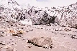 ![]() Čelo ledovce Gangotri. V pozadí se tyčí vrcholy Bhagirathi. | |