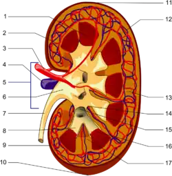 Nefrony se dělí na dva základní typy – korové, v kůře ledviny, které mají krátké Henleovy kličky a juxtamedulární, ze kterých odcházející arterioly jdou ve formě přímých cév (vasa recta) do hloubky dřeně a tu zásobují krví. Její zvýšené prokrvení způsobí pokles osmolality dřeně (tzv. vymývací efekt) a tím poklesne i koncentrační schopnost ledvin (tlaková diuréza).