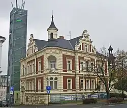 Jedná se o trojkřídlý nárožní objekt. Hlavní průčelí, orientované do Komenského aleje, je zvýrazněno centrálním rizalitem se štítem. V bočním průčelí je rizalit podobného charakteru, ale mělký. Nároží dominuje dvoupatrový válcový arkýř. Fasády kombinují režnou cihlu a omítku. Střecha je valbová. V interiéru se dochovaly původní štukové dekorace.[1][4]