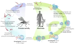 Přenašeč nasaje amastigoty společně s makrofágy a krví. V jeho střevě se bičíkovci množí jako promastigoti. Ti se při sání dostávají do tkání hostitele, kde jsou rychle fagocytováni makrofágy. Uvnitř makrofágu dochází k rychlé transformaci promastigota do amastigotního stadia, které je v makrofágu uzavřeno do parazitoforní vakuoly, ve které se množí. Při jejím prasknutí paraziti infikují další fagocyty. Tento proces se několikrát opakuje. Phlebotomus se nakazí sáním na infikovaném hostiteli.[1]