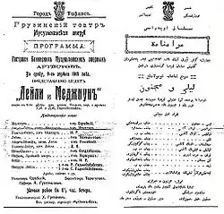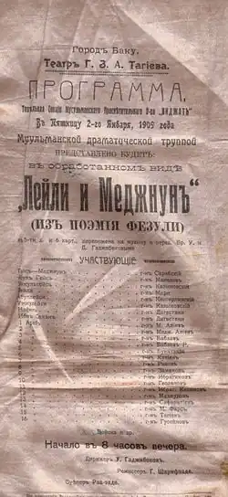 ![]() Plakát premiéry Lejly a Medžnuna z roku 1908 | |