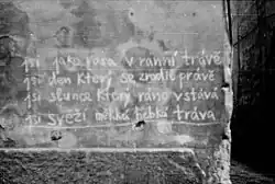 - ↑ a b Verše ze zdi: opsáno v lednu 1977 ze zdí zahrad a domů na Velkopřevorském náměstí na Malé Straně v Praze. Vydáno v počtu 111 neprodejných číslovaných výtisků. Upravil a vytiskl Eugen Weidlich s fotografiemi Ivana Lutterera. Účastníkům slavnostní večeře Spolku českých bibliofilů v Praze na Vikárce dne 2. dubna 1977 věuje podnik Restaurace a jídelny v Praze 1. 22 s.