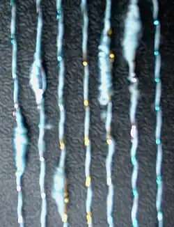 - Méně známé je použití k paličkování a ve směsových přízích na ruční pletení.[8] (Na prostředním snímku vpravo je příze 256 tex ze směsi acetátu a polyesteru obeskaná pokovovaným polyesterovým filamentem. Tyto příze se vyráběly v 80. letech 20. století).