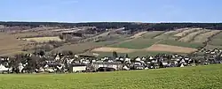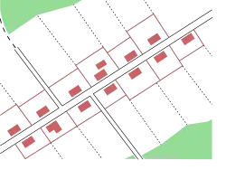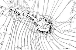 Stavení byla zakládána buď na jednom či na obou březích potoka po stranách cesty, jež obvykle procházela údolím. Každá chalupa, statek, či hospodářství stála na vlastním pruhu pozemku – lánu. Ke každému hospodářství náležel též kus lesa, který sahal až k rozvodí určujícímu hranice vsi. Způsob obdělávání půdy postupoval v pořadí: zahrada, pole, louky a les.[2]