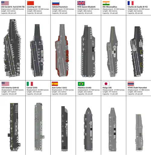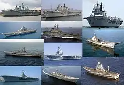 Letadlové lodě HMS Ark Royal (91), HMS Illustrious, HMS Invincible, Admiral Kuzněcov, Giuseppe Garibaldi, Chakri Naruebet, INS Viraat, Charles de Gaulle, São Paulo, SNS Principe de Asturias a Vikramaditya. (2007)