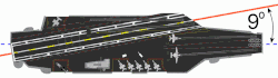 Schéma leteckých operací na letadlové lodi s úhlovou palubou: zatímco letouny mohou startovat z příďových katapultů, vyosená dráha je volná pro přistání (které je někdy nutno opakovat)