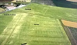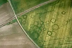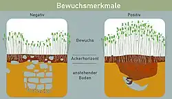 Porostové (též vegetační) příznaky jsou nejvýznamnějším způsobem identifikace pohřbených archeologických památek pomocí letecké prospekce.[53] Půda má v místě výskytu archeologických objektů odlišnou chemickou skladbu i strukturu než nedotčené okolí, což způsobuje změny na vegetaci, která z této půdy vyrůstá. Nad zahloubenými objekty, jejichž výplň má obvykle vyšší obsah živin a déle zadržuje vodu, mají rostliny lepší podmínky k životu. Vyznačují se vyšším vzrůstem, vyšší hustotou i sytější barvou, obvykle také později dozrávají (tvoří tzv. pozitivní porostové příznaky). Naopak nad konstrukcemi má porost málo vláhy i nedostatek místa pro kořeny, je proto nižší a řidší než v okolí (tvoří negativní porostorvé příznaky).[52]