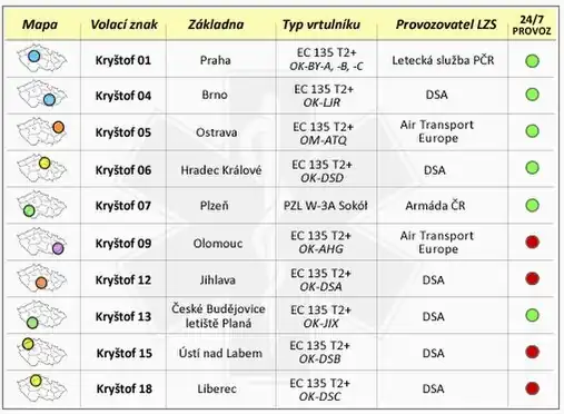 Leteckou záchrannou službu na stanicích Kryštof 09 v Olomouci a Kryštof 05 v Ostravě, zajišťuje soukromá společnost Air – Transport Europe, na stanicích a Kryštof 12 v Jihlavě soukromá společnost DSA stejně jako na stanicích Kryštof 18 v Liberci, Kryštof 15 v Ústí nad Labem, Kryštof 06 v Hradci Králové, Kryštof 13 v Českých Budějovicích, Kryštof 04 v Brně. Na stanici Kryštof 01 v Praze slouží vrtulníky Letecké služby Policie ČR, zatímco leteckou záchrannou službu na stanicích Kryštof 07 v Plzni a zajišťuje Armáda České republiky.[17][18]