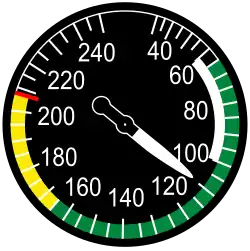 - Zelený oblouk vyjadřuje bezpečný rozsah rychlostí. Začíná na pádové rychlosti bez vysunutých klapek (VS1) a končí na maximální normálně dovolené rychlosti (VNO)