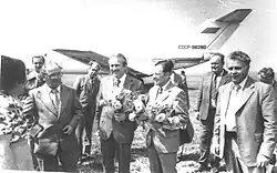 29. května 1979: Jakovlev Jak-40C2 (СССР-88280) letiště Balti (Letiště Bălți-Město). Odjezd vysokých funkcionářů ÚV KSČ: Josefa Lenárta a Miloše Jakeše z Moldavské SSR. V popředí zleva: Ivan Bodiul (druhý zleva), první tajemník ÚV KSČ Moldavska, Jozef Lenárt, tajemník ÚV KSČ Miloš Jakeš a předseda Rady ministrů Moldavské SSR Semjon Grossu na letišti v Baltu.