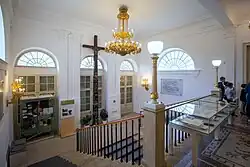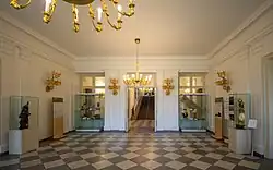 Z původního vybavení interiérů se zachovaly dřevěné zlacené lustry, dvojramenné nástěnné svícny, ostění dveří, většina zlaceného mosazného kování a zábradlí schodiště.