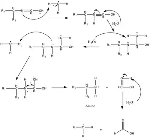 Mravenčan amonný se nejprve disociuje na kyselinu mravenčí a amoniak, amoniak poté nukleofilně atakuje karbonylový uhlík.[3] Kyslík deprotonuje dusík a vytvoří hydroxyl. Hydroxyl se poté protonuje vodíkem z kyseliny mravenčí, čímž vzniká molekula vody a rezonančně stabilizovaný karbokation. Ten následně reaguje s vodíkem pocházejícím z kyseliny mravenčí a vytvoří se oxid uhličitý a amin.