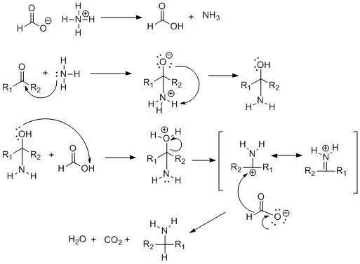 Formamid nukleofilně atakuje karbonylový uhlík,[3] poté je kyslík protonován odštěpením vodíkového atomu od dusíku, což vytvoří vodu a rezonančně stabilizovaný N-formylový meziprodukt.[3] Voda hydrolyzuje formamid na mravenčan amonný, jenž slouží jako aktivní redukční činidlo a váže se na N-formylovou sloučeninu. Proběhne přenos hydridu, který způsobí oddělení oxidu uhličitého. Amonný kation vytvoří imin a uvolní amoniak. Imin je nakonec hydrolyzován za tvorby aminu.