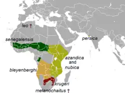 Donedávna bylo rozneznáváno okolo deseti poddruhů lva. Rozdíly mezi nimi však nebyly výrazné jak po stránce morfologické, tak z hlediska molekulárních znaků. Někteří autoři proto považovali lva za monotypický druh.[13] Rozsáhlá taxonomická revize čeledi kočkovitých (Felidae) z roku 2017 provedená pod záštitou IUCN považuje dříve rozlišované subspecie za regionální morfotypy a rozděluje druh pouze do dvou recentních poddruhů Panthera leo melanochaita (jih a východ Afriky) a Panthera leo leo (střed a sever Afriky + Indie).[14]