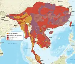 Jde o nenápadného obyvatele rozlehlých lesů asijských tropů a subtropů. Území výskytu začíná na západě ve středním Nepálu, táhne se přes Bhútán a severovýchodní Indii směrem na východ a jihovýchod. Malá populace žije i v Bangladéši. Oblast rozšíření pokračuje přes Myanmar do Číny a do zemí Indočíny (Vietnam, Laos, Kambodža). Jižní hranicí je Malajský poloostrov (Thajsko, Malajsie). Na východě dříve obývala tato šelma i ostrov Tchaj-wan, ale zde byla vyhubena. Severní hranici výskytu představuje střední Čína.[11][23][24][25][26]