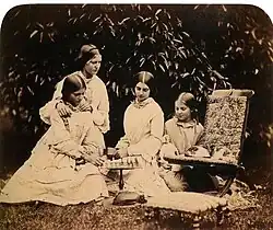 - Jeho sestry: Christina Georgina Rossetti (1830–1894, anglická básnířka, proslavila se básní Goblin Bazaar, na její počest je pojmenován sopečný kráter Rossettiové na Venuši) a Maria Francesca Rossetti (1827–1876, anglická spisovatelka, byla milenka Johna Ruskina, jejich vztah začal, když jí bylo 28 let, po zrušení Ruskinova manželství; byla hluboce věřící anglikánkou, vydala učebnici o studii Božské komedie Dante Alighieriho, tato fotografie je jednou z několika jejích fotografií) pozorují jejich hru.