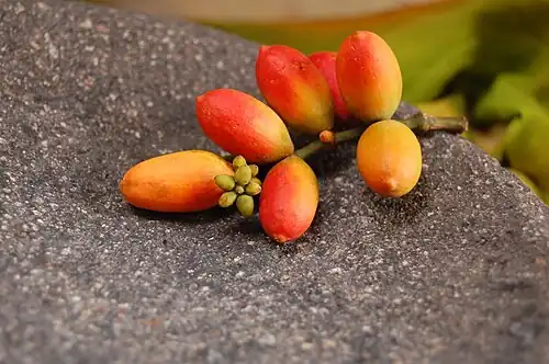Vejčité plody s tenkou kůží jsou 1 až 3,5 cm dlouhé, nejdříve žluté, později červené s oranžovým nádechem, bývají uspořádány do kompaktních přeslenů, téměř nemají stopku. Plod soudkovitého tvaru se zašpičatělými konci váží okolo 5,5 gramů a má jedno semeno o váze 3,8 gramů. Tento druh za příznivých podmínek plodí třikrát ročně, březen/duben, červen/červenec/ a září/říjen, za rok strom vyprodukuje asi 80 až 100 kg semen. Plodit začíná ve věku 5 až 8 let. Životnost stromů je 100 i více let.