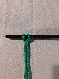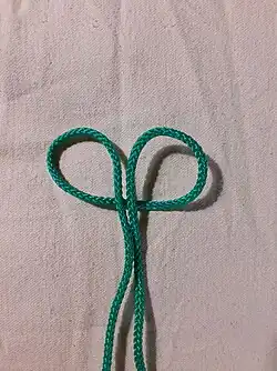 - Nejprve přesuneme vrchol kličky směrem ke koncům lana a tím na laně vytvoříme 2 očka. Tato 2 očka přetáhneme přes sebe a navlékneme na kůl.[2]