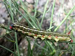 Housenky jsou ve zbarvení poměrně proměnlivé. Po vylíhnutí měří 4 mm, mají zeleno-bílé tělo s černým růžkem na konci a černou hlavičku. S růstem housenky barva tmavne do olivově zelené s černým mramorováním a průběžnými bělavými pruhy po bocích. Někdy mohou být součástí vzoru červené či tmavě modré kapkovité skvrny. Růžek je v pozdějších fázích vývoje červený s černou špičkou, drsný. Housenka může dorůstat 65–80 mm délky.[1]