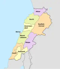 Libanon se administrativně člení na 9 guvernorátů (muḥāfaẓah). Tyto jednotky zřejmě neužívají své vlajky, užívají se však vlajky vojenských oblastí, odpovídající guvernorátům – resp. ji užívá 5 těchto oblastí.[2] (nejsou obrázky) Vlastní vlajku zřejmě užívá i hlavní město Bejrút.[4] (není obrázek)
