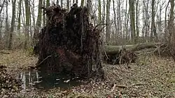 Tůň v bezzásahové části Havrany se spadanými stromy -